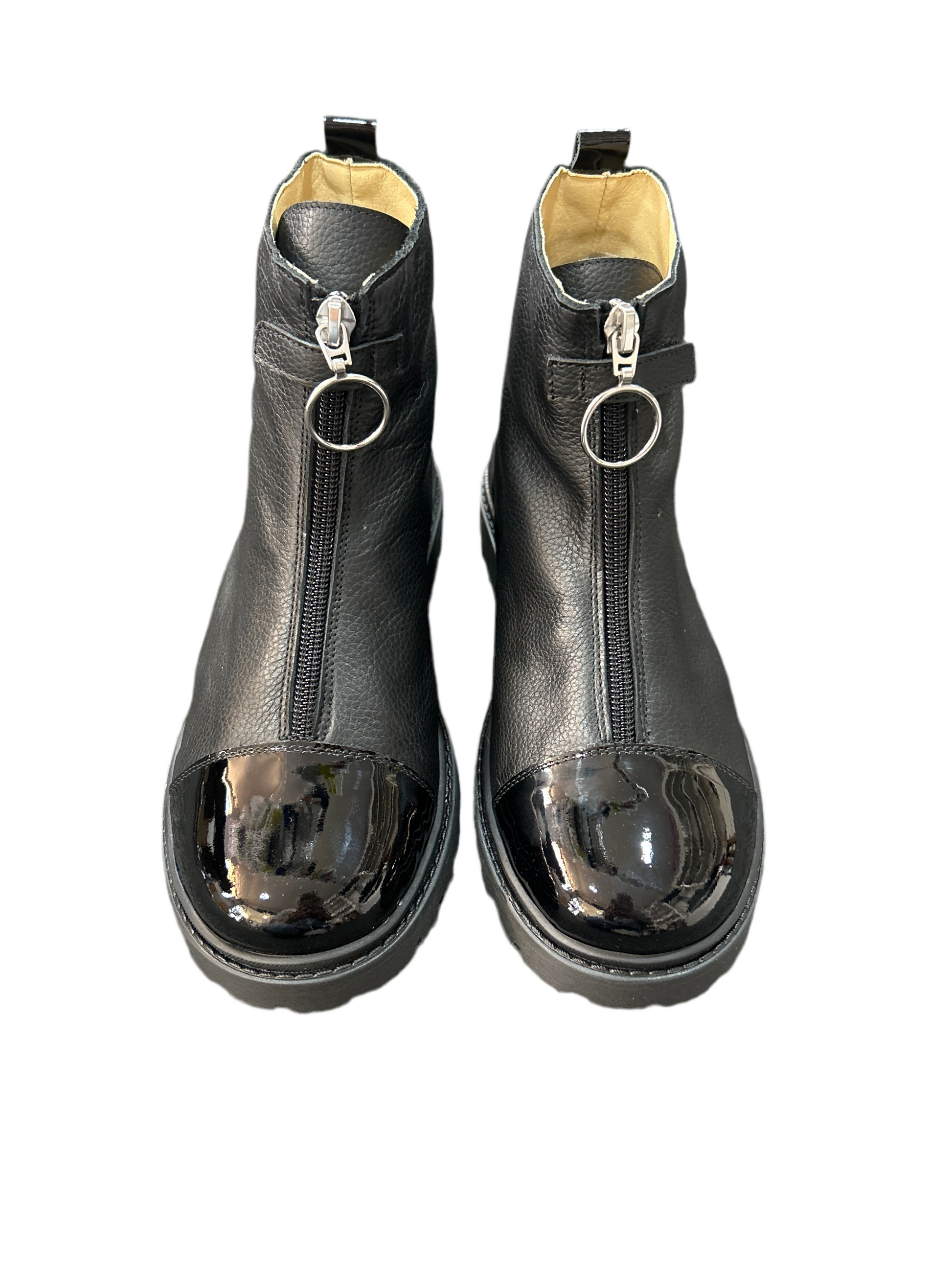 black supportive trendy boot, with zip in the front and chunky sole for harder wear