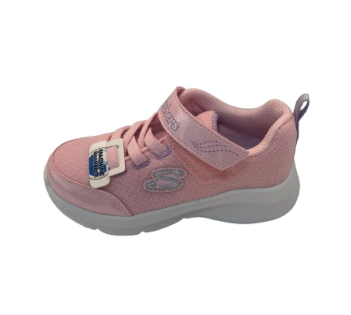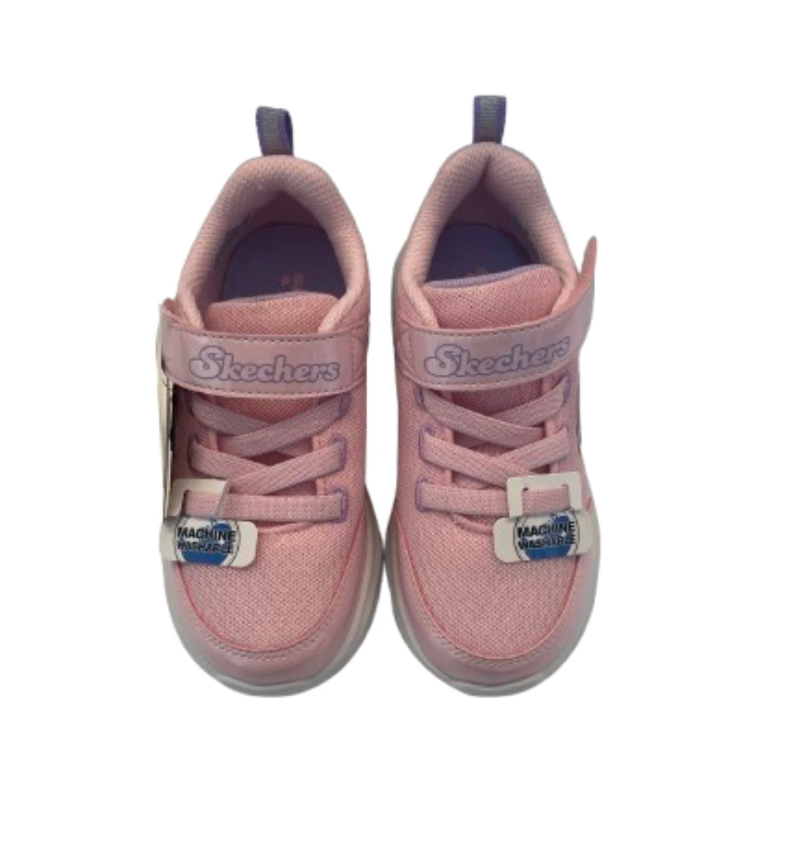 Take on the playground in shine-on comfort wearing Skechers. This sporty comfort sneaker features a sparkle mesh and glossy synthetic upper with stretch laces, an adjustable instep strap, and a cushioned comfort insole.