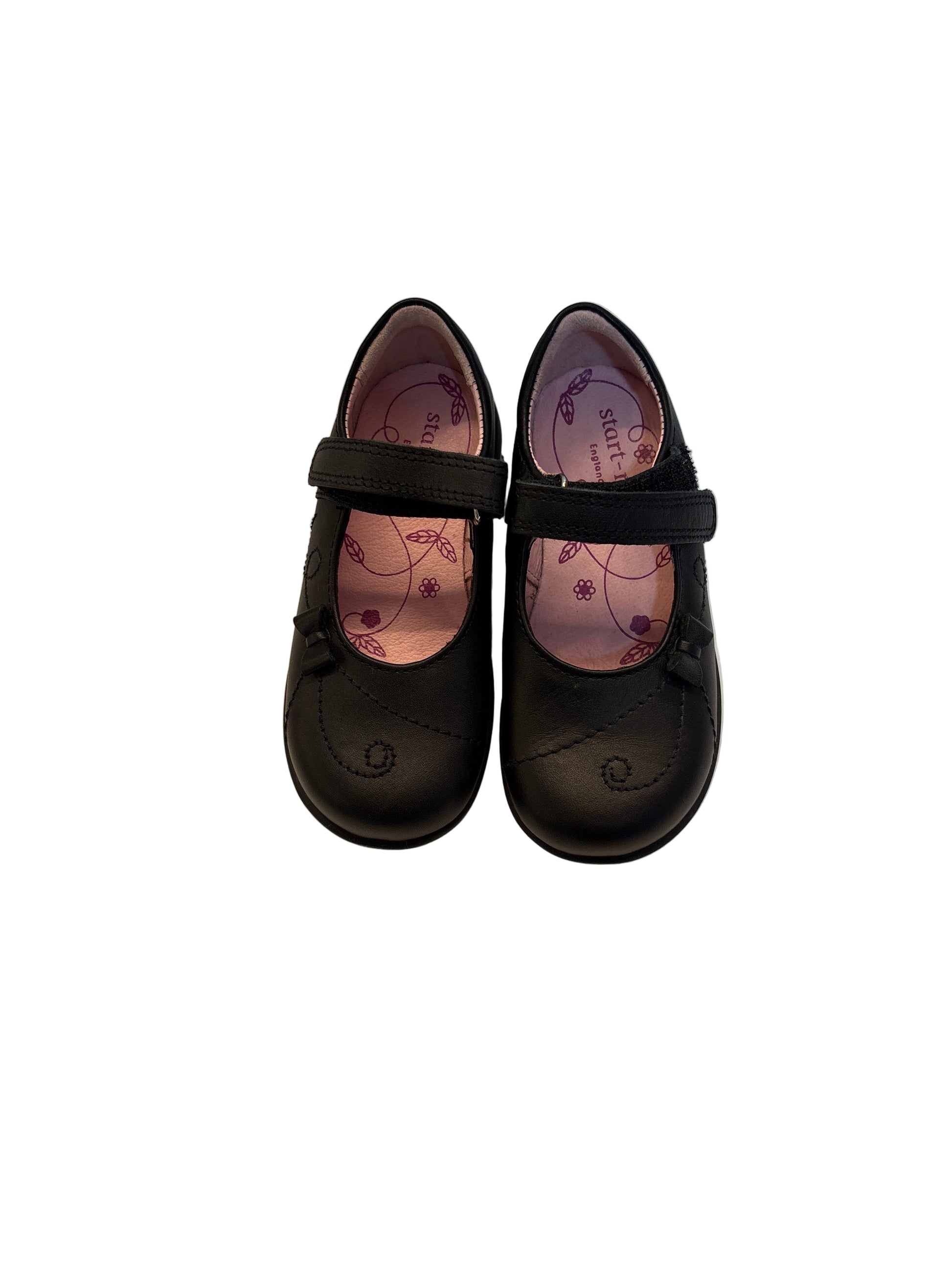 Beautiful soft black leather shoe with a bow on the front and Velcro strap