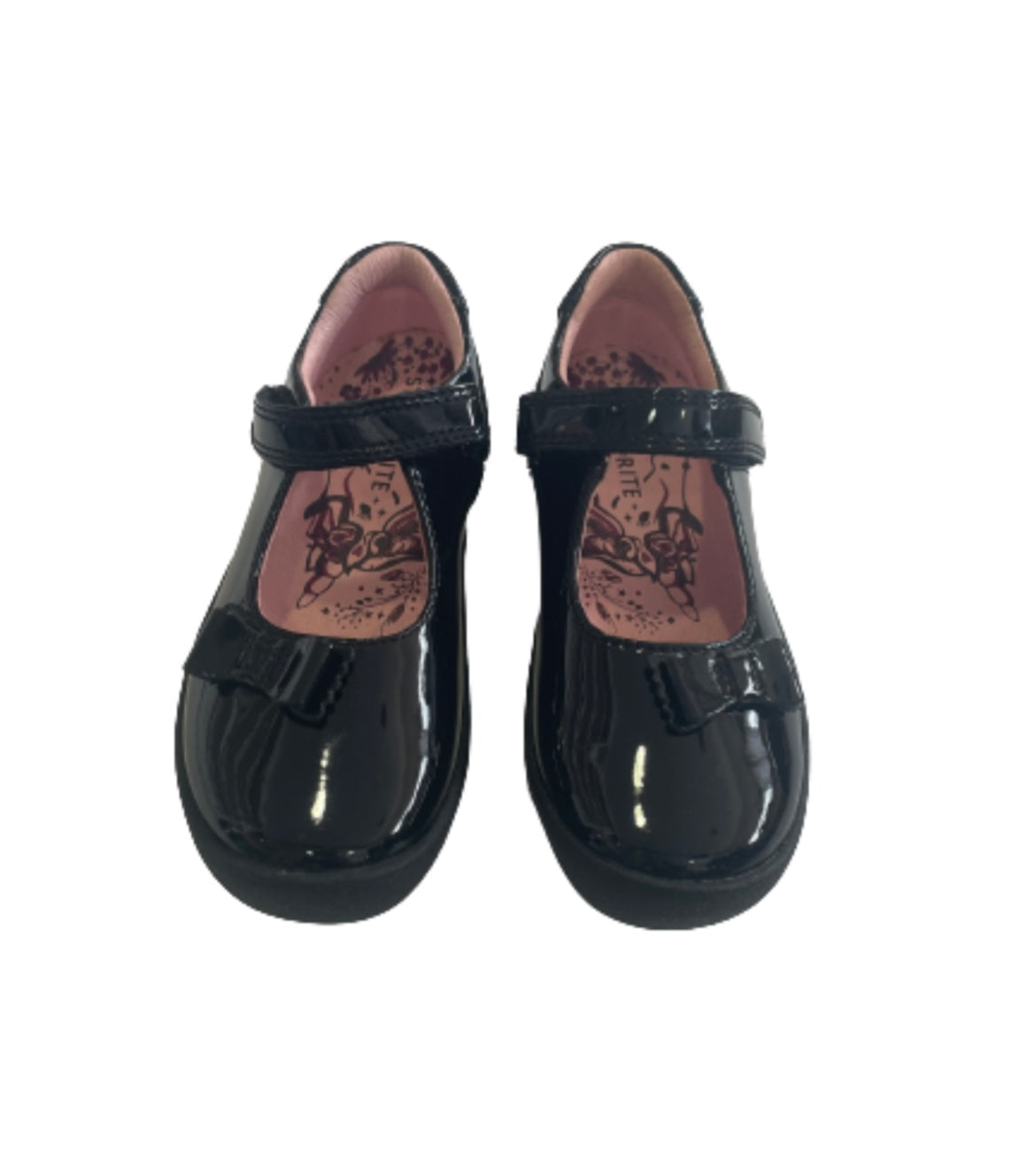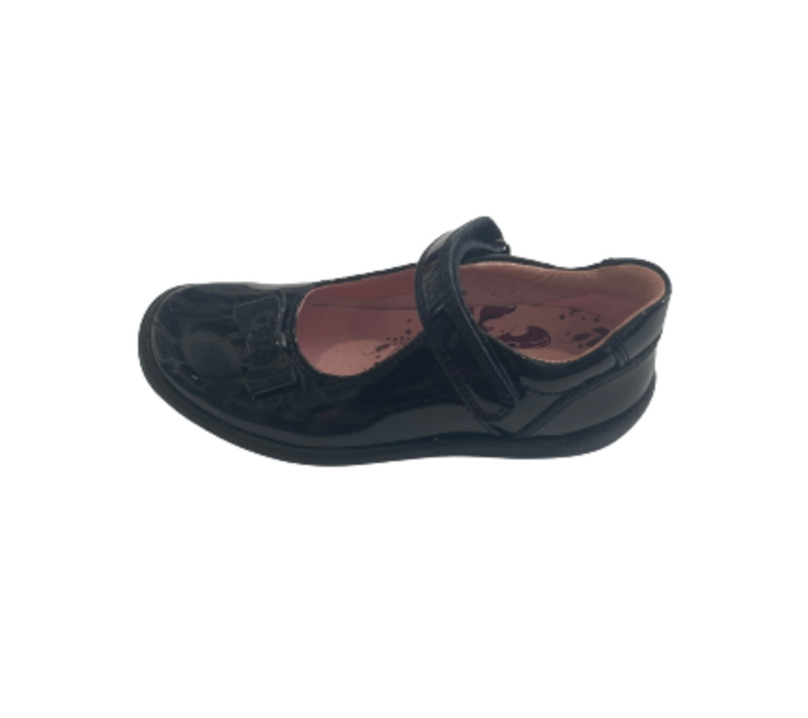 Girls soft black leather patent school shoes with a Velcro strap and bow design. Reinforced heel to stop pronating