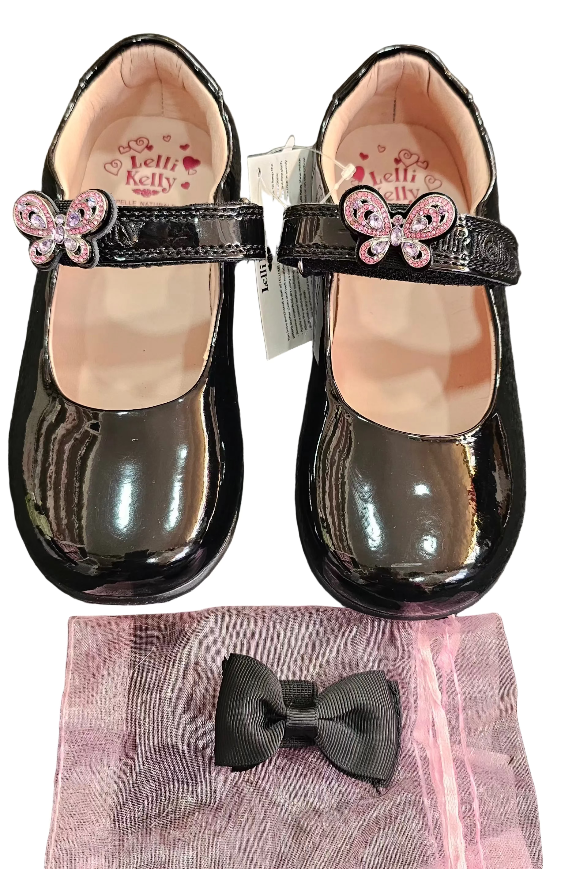 Italian designed school shoe. Leather lined black patent outer. Removeable butterfly and bow. These are a g fitting but lelli kelly comes up narrow.