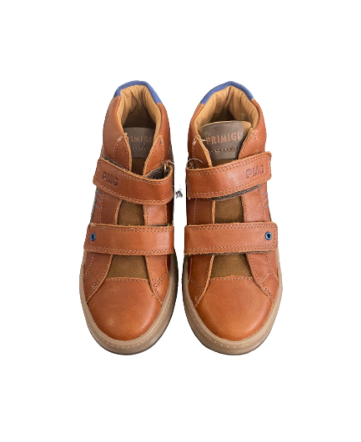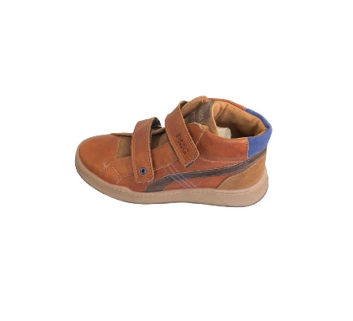 Boys brown leather high top boot with navy trim and double Velcro strap